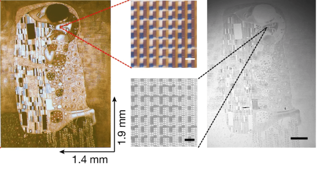 The team demoed this new tech in fun scientist fashion by showing a tiny version of Klimt’s artwork “The Kiss” on a surface area of 1.4 x 1.9 millimeters – about 1/4000th of a smartphone. I’ve got to say, it looks pretty good!