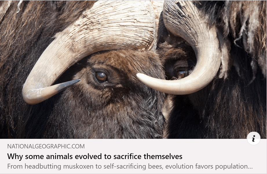 From headbutting muskoxen to self-sacrificing bees, evolution favors populations, not individuals.