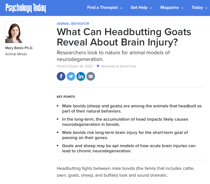 Psychology Today – What can headbutting goats reveal about brain injury?