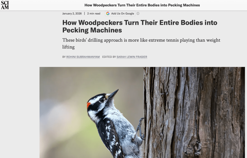 Scientific American – How woodpeckers turn their entire bodies into pecking machines