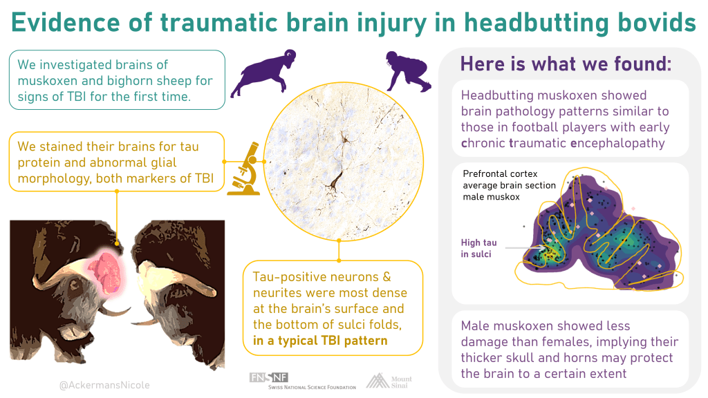 Bovids like bighorn sheep and muskoxen are charismatic species that perform extreme headbutting fights. In 2022 I established that headbutting leads to chronic brain damage in these animals, with neuropathology akin to chronic traumatic encephalopathy, as seen in football players.