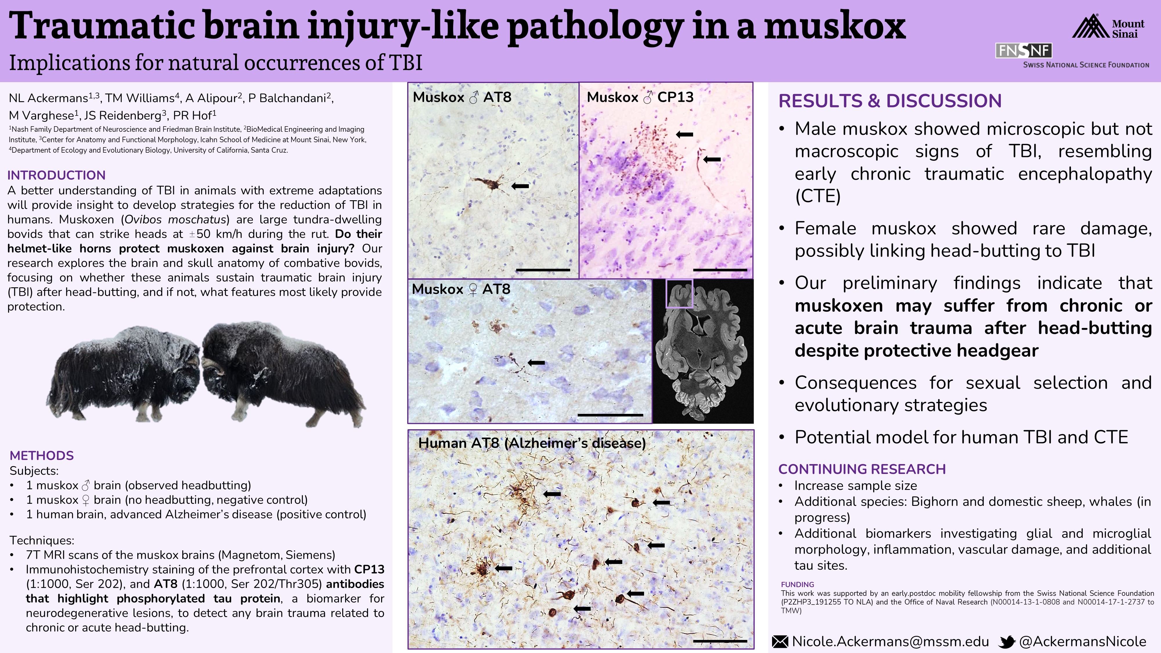 Ackermans NL, Varghese M, Williams TM, Grimaldi N, Selmanovic E, Alipour A, Balchandani P, Reidenberg JS, Hof PR. Evidence of traumatic brain injury in headbutting bovids (2022). Acta Neuropathologica. doi.org/10.1007/s00401-022-02427-2